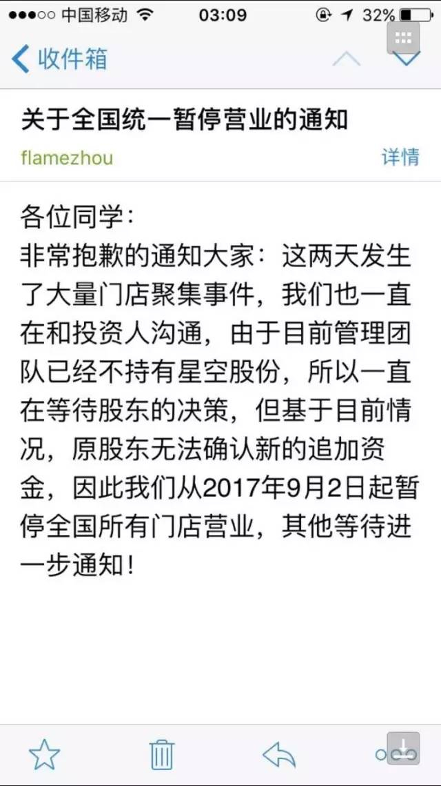 通知称:“各位同学,非常抱歉地通知大家,这两天发生了大量门店聚集事件,我们也一直在和投资人沟通,由于目前管理团队已经不持有星空股份,所以一直在等待股东的决策,但基于目前情况,原股东无法确认新的追加资金,因此我们从2017年9月2日起暂停全国所有门店营业,其他等待进一步通知!”。
