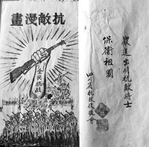 这个小册子的封面写着《抗倭战画》,线装订,扉页手写“爱国家、还我山河”。后边每一页都是一幅手绘彩色画。作者写明:欢送出川抗敌将士保卫祖国,落款是四川省抗敌后援会。