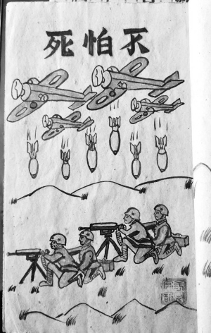 第一页写着“抗战漫画:全民抗战”字样;第二幅画着一个日本兵残杀中国人,写着破坏和平的刽子手;第三幅是日军飞机轰炸,而下边是专心抗战的中国士兵,写着三个字“不怕死”……即使今天再看这些画册,那些为国家不计生死的豪情,依然跃然纸上。有四川省的藏家想向张广胜求这个册子,虽然知道这本册子对四川意义更大,但张广胜的小气劲犯了,说什么都舍不得。