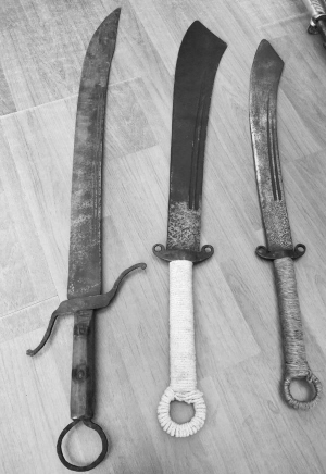 东北抗日义勇军(左)和国民党29军所使用的军刀(中),右一是抗战时期国民党军队使用的军刀