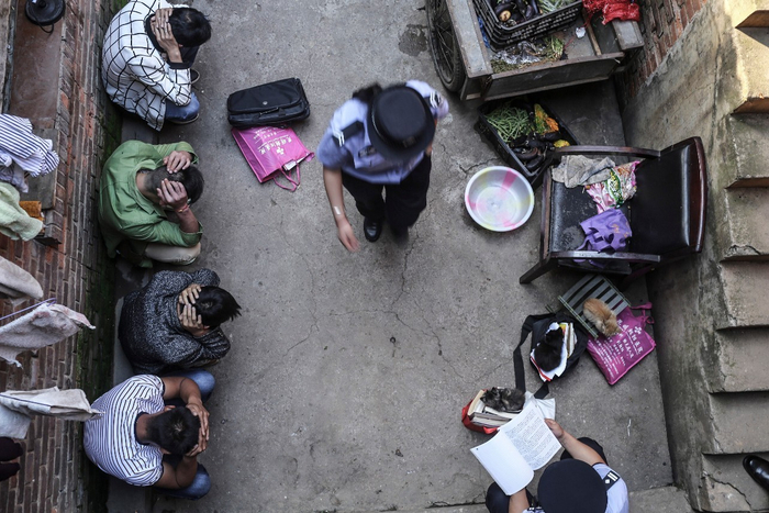 见到有人照相,传销人拿起警察发的“打击传销”的传单挡住脸/视觉中国