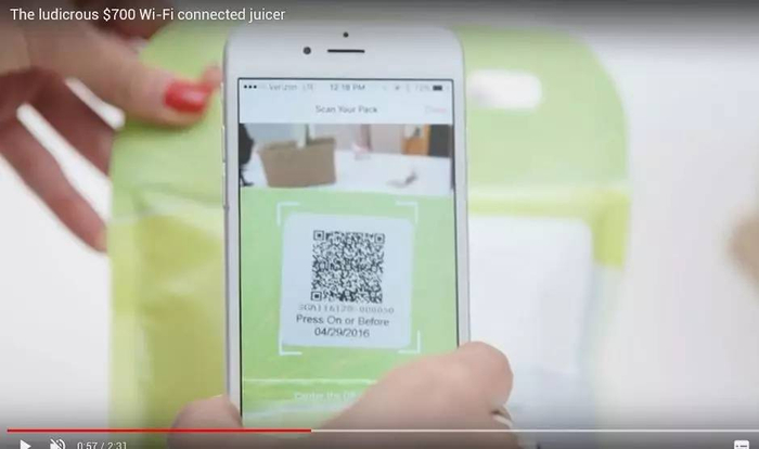 此外,这些主打互联网概念的“果汁材料包”还有二维码可供扫描。用户扫码之后,手机上可显示出材料包内商品的生产信息。并且联网后的智能榨汁机还可以读取这些信息。如果有变质、过期的不新鲜材料包被投入机器,榨汁机将拒绝工作。