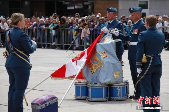 图为加拿大总督约翰斯顿(右)向空军旗手正式授旗。作为英联邦国家,加拿大的皇家空军旗包括女王旗和统帅旗。 中新社记者 余瑞冬 摄