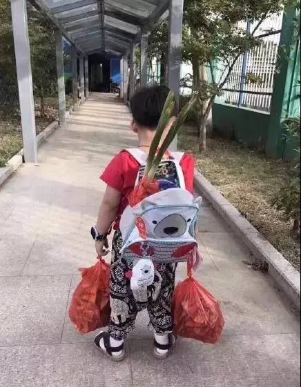小朋友的妈妈告诉记者,9月1日是儿子呦呦入学第一天,她特意发朋友圈为儿子祝福," 美好的期许今天开始,孩子,带着大家的祝福启航吧!所有的小朋友们,一起加油 "。引起大家注意的,是朋友圈里呦呦的照片,只见呦呦一身 " 隆重的装备 ",背后的大书包里更是塞得满满的。最显眼的就是插着一根葱,两只小手里还各拎着一袋东西。