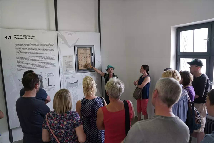 图为参观者在达豪集中营内听讲解员介绍囚犯被要求佩戴的各色标志。不同颜色代表着不同的所谓“罪行”。(新华社记者袁帅摄)