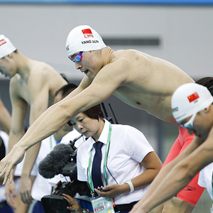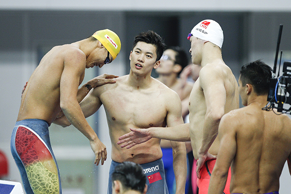 男子4×100米自由泳接力决赛,当辽豫粤代表队的余贺新和浙港队的徐嘉余先后冲线后,余贺新在一把搂住徐嘉余的头,名次的先后。