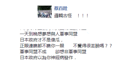 该人士表示,美日军机军舰具有通联机制避免误伤,“台与日本建立情报交换机制是有必要的,免得到时要打谁都不知道”,因此,“军事对话、情报信息共享可说是现在‘台日安保议题’的当务之急”。对此,有台湾网友讽刺称,“一天到晚梦想与别人建立‘军事同盟’,日本政府连瞧都不瞧你一眼,不觉得很丢人吗?”
