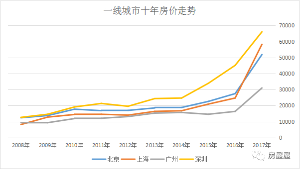 2008年时,广州房价与北上深还在同一条起跑线,1万元左右,而到了十年后,当北上深房价全部突破5万时,广州房价却还在3万左右徘徊。
