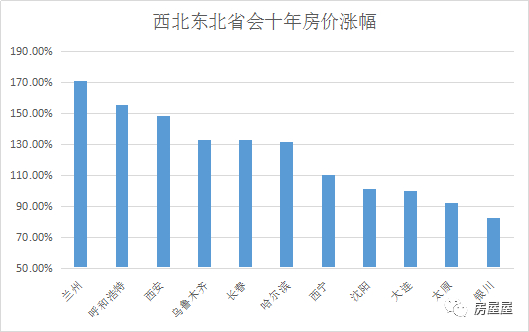 然而,部分西北、东北城市,房价涨幅甚至都没翻倍,十年房价涨幅不到100%,垫底的银川,十年涨幅只有81.86%。