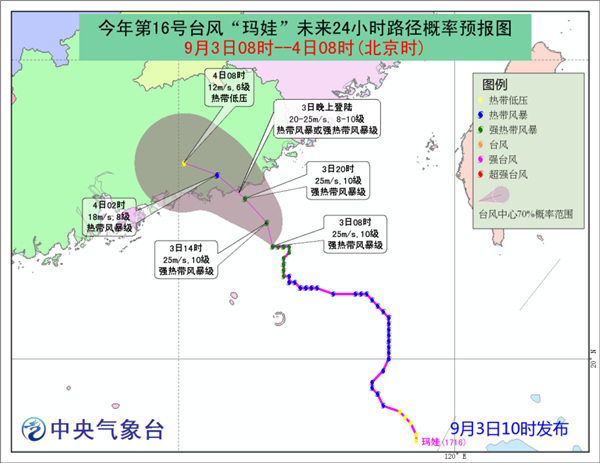 今年第16号台风“玛娃”(强热带风暴级)的中心今天(3日)上午10点钟位于广东惠来南偏东方约110公里的南海东北部海面上,就是北纬22.1度、东经116.6度,中心附近最大风力有10级(25米/秒),中心最低气压为990百帕,七级风圈半径130-200公里。
