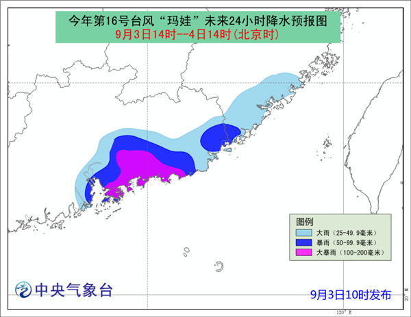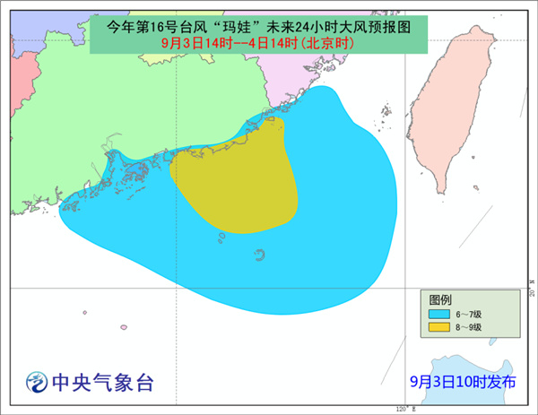 大风预报:3日14时到4日14时,南海东北部、福建东南部沿海、广东中部和东部沿海、珠江口区将有6-7级大风,“玛娃”中心经过的附近海域或地区的风力有8-10级,阵风可达11-12级。