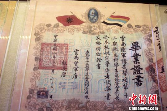 现场展出的“云南陆军讲武学校”颁发给叶剑英的毕业证书(复制品)。 于俊亮 摄