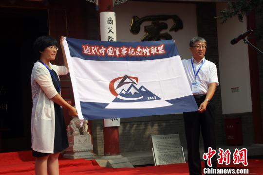 保定军校纪念馆馆长曾素梅(左)向黄埔军校旧址纪念馆馆长杨琪交接“近代中国军事纪念馆联盟”旗帜。 于俊亮 摄