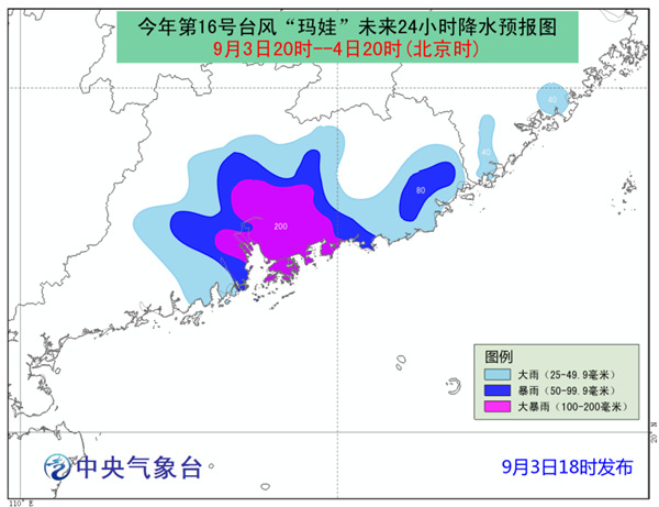 “玛娃”登陆将形成强风、暴雨、大浪“三碰头”的不利局面。广东、福建部分沿海地区将出现大风,中央气象台预计,3日20时到4日20时,南海北部、福建东南部沿海、广东中部和东部沿海、珠江口区将有6-8级大风,部分海域或地区的风力有9级,阵风可达10-11级。