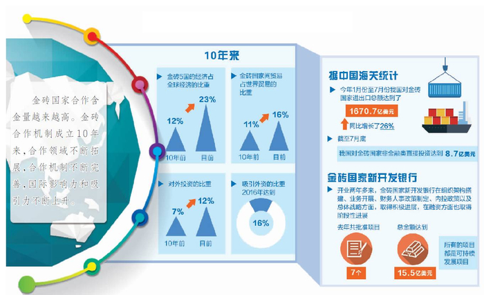10年来,金砖5国经济占全球经济的比重已经从10年前的12%上升到23%;金砖国家间贸易占世界贸易的比重从11%上升到16%;对外投资的比重从7%上升到12%;吸引外资的比重2016年达到16%,对世界经济增长的贡献率达50%。