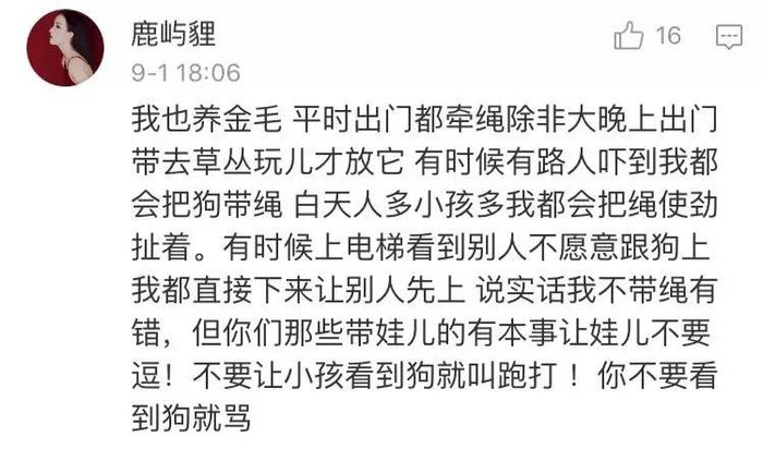 知名法律博主、cctv“热线12”栏目的嘉宾律师杨文律发表了个人的观点,他认为问题的焦点在于“狗主眼里的狗和路人眼里的狗不可能是一条。”狗主人外出不拴狗绳,理由都一致“我家狗不咬人!”但是并没有考虑过别人的感受,对于小孩或者一些害怕狗的市民来说,无论狗狗是否温顺,是否咬人,对他们来说都是恐惧的。