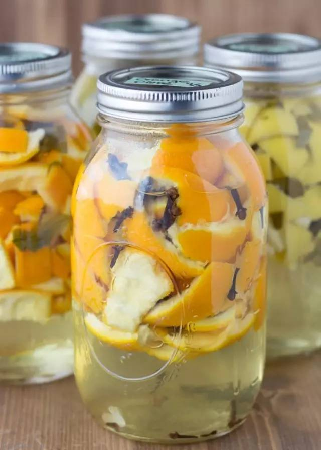 准备一个大瓶,一些橘子皮、柚子皮都可以,将皮装入瓶子内,然后加入1勺食醋和2勺食用碱,再加水没过柚子皮。