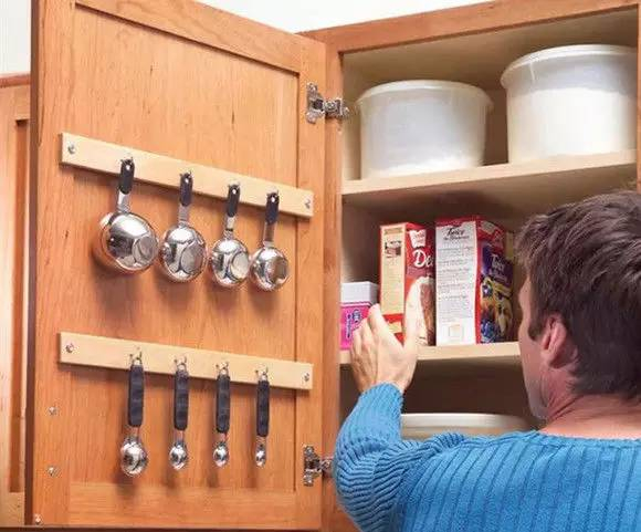 也可以把橱柜门这个小空间利用起来。在上边固定几个粘钩,锅盖可以有序地组织到门后。