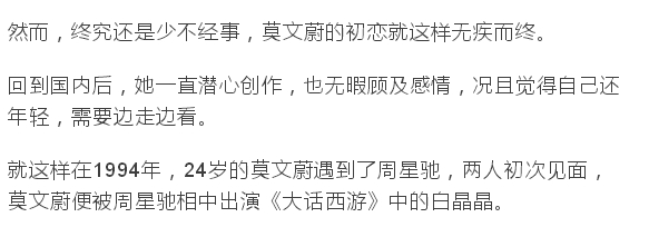 但她并没有对周星驰表露自己的爱意,因为当时周星驰正在跟“紫霞仙子”朱茵谈恋爱,她只好把这份心思藏起来,此后不再想其他,只一门心思的好好演戏。