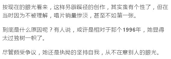 可是即便她费尽心思的打扮,唱片的销量仍然不乐观,只卖出去八百多张,其中还有几十张是她自掏腰包买了送给朋友的,没过多久唱片公司也倒闭了。