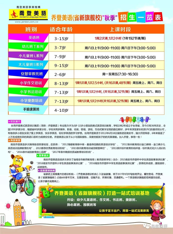 35年历史,1000余家分校,3-15岁幼少儿学习殿堂,台湾乔登美语于2011年6月18日强势进驻南安市,并于2013年9月1日入驻省新镇开设分校(原金太阳幼儿园4楼),以强大的师资阵容,专业化的管理团队,多年来锻造了众多成绩优异的英语口语听力成绩佼佼者。乔登美语让孩子从小与国际接轨,深度挖掘孩子的的无限潜能。加入乔登,享用一生!
