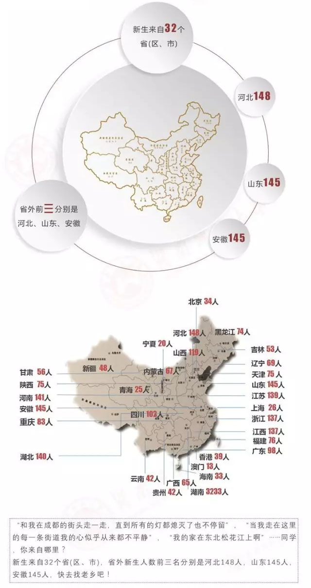 湖南师范大学本科新生来自全国32个省(区、市),在本省招人3233人,省外招生2466人。其中河北招生148人,山东和安徽都是招生145人。在本省的招生人数比外省总和还要多出767人,湖南师范大学,毕竟还是湖南的。