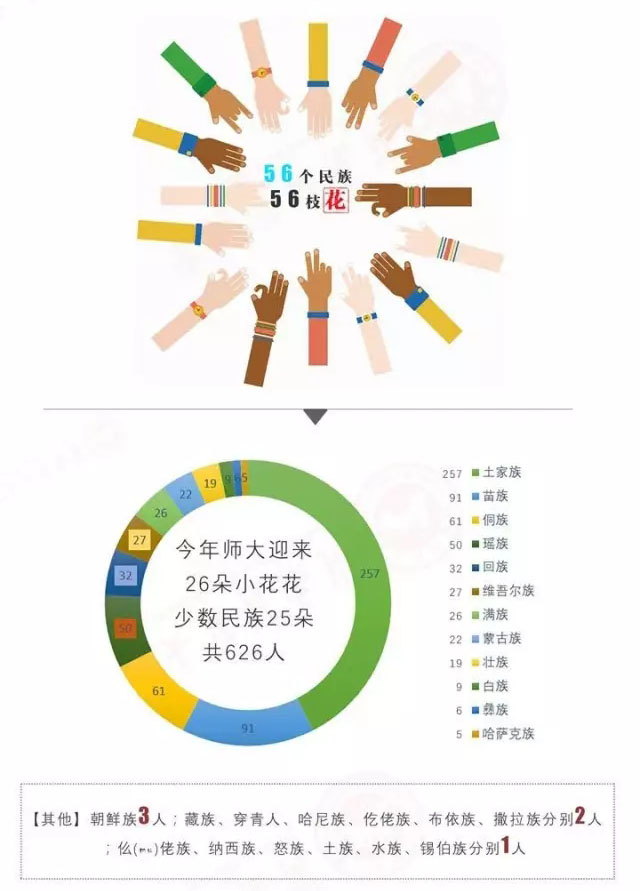 今年的新生中,少数民族新生来自25个民族、626名,其中土家族最多,有257名,其次是苗族91名。少数民族新生在5699名新生中占比11%。