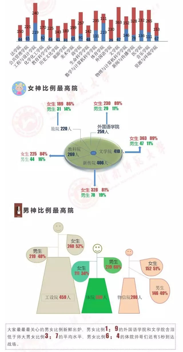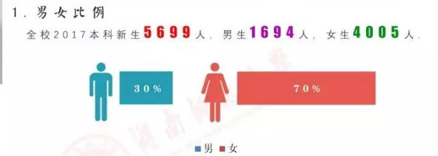 2017年湖南师范大学本科新生共有5699人,其中男生1694人,女生4005人,女生比例高达70%。根据以往的就业资料,今年本科新生男女比例维持着以往比例。