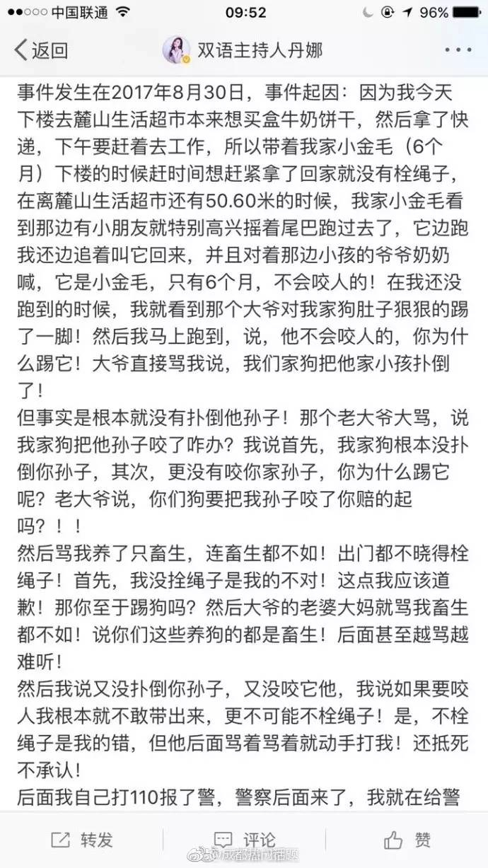 8月31日,邓女士以“双语主持人丹娜”为名在微博上发表长文,讲述自己遛狗时因未拴牵引绳被邻居暴打的过程,同时附上了超市的监控视频。而通过调查超市的监控视频,还原了现场情况。