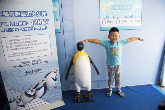2017年9月2日,沈阳某地产开发商举办极地企鹅嘉年华活动。邀请了大连圣亚海洋世界的六只极地企鹅来沈阳,吸引了众多小朋友近距离与企鹅互动。(图片来源:视觉中国)
