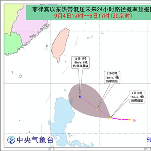 中国天气网讯 中央气象台消息,菲律宾以东热带低压的中心今天(4日)下午5点钟位于菲律宾马尼拉东偏北方大约600公里的洋面上,就是北纬16.6度、东经126.2度,中心附近最大风力7级(15米/秒),中心最低气压为1002百帕。