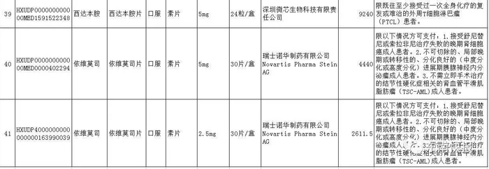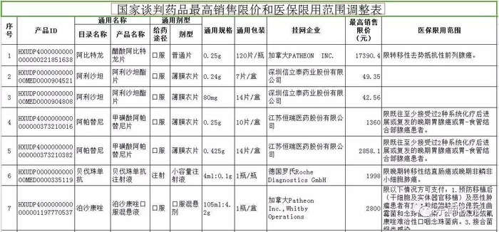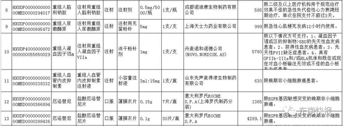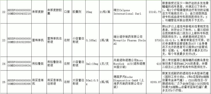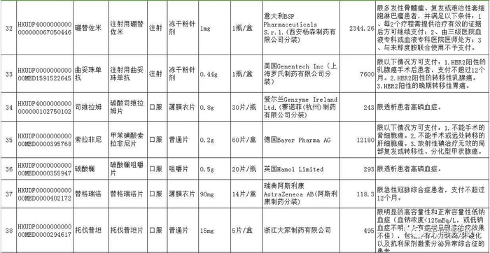 利拉鲁肽、替格瑞洛、重组人尿激酶原、重组人凝血因子Ⅶa、重组人脑利钠肽、托伐普坦、阿利沙坦酯、吗啉硝唑氯化钠、泊沙康唑、曲妥珠单抗、贝伐珠单抗、尼妥珠单抗、利妥昔单抗、厄洛替尼、索拉非尼、拉帕替尼、阿帕替尼、硼替佐米、重组人血管内皮抑制素、西达本胺、阿比特龙、氟维司群、重组人干扰素β-1b、依维莫司、来那度胺、喹硫平、帕罗西汀、康柏西普、雷珠单抗、司维拉姆、碳酸镧、银杏二萜内酯葡胺注射液、银杏内酯注射液、复方黄黛片、注射用黄芪多糖、参一胶囊。