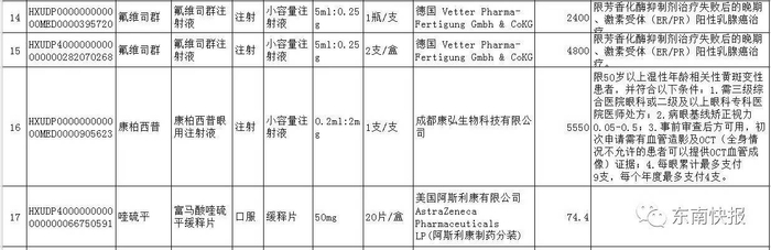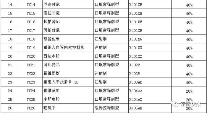西药中有15种是肿瘤治疗药,覆盖了肺癌、胃癌、乳腺癌、结直肠癌、淋巴瘤、骨髓瘤、白血病等常见肿瘤。其他分别为治疗心血管病、肾病、眼病、精神病、抗感染、糖尿病等重大疾病或慢性病的药物,以及治疗血友病和治疗多发性硬化症两种罕见病用药。中成药中有3种是肿瘤药,另外2种是心脑血管用药。