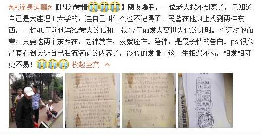 “一位老人找不到家了,只知道自己是大连理工大学的,连自己叫什么也不记得了。民警在他身上找到两样东西,一封40年前他写给爱人的信和一张17年前爱人离世的火化证明。”