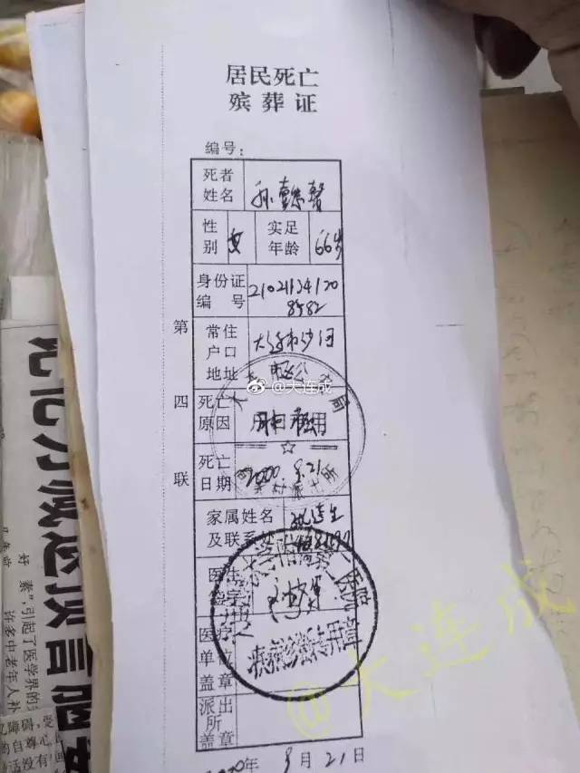 记者注意到,微博原文中,一位民警扶着一位戴着白色帽子的老人, 老人看上去至少80多岁。而配图中,第二第三张图是一封信,信纸上带有“国营辽宁省庄河县长岭农机修造厂”字样,第四张图是一张居民死亡殡葬证。