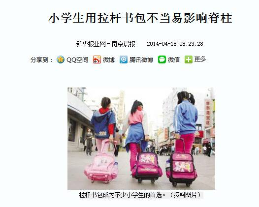不过,也有学校没有强制性规定,只是不建议学生使用。比如,市民杨女士告诉广州参考记者,去年女儿所在的越秀区某小学就通知过不允许使用拉杆书包,但还是有不少孩子带着去。