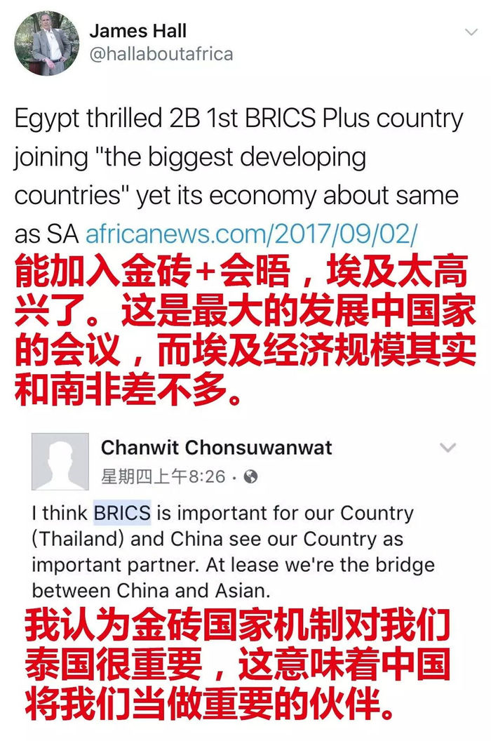 不只是泰国,最近几天,埃及、几内亚、墨西哥、塔吉克斯坦这四个国家的媒体和网友,也都在密切关注本国领导人的中国厦门之行——明天(9月5日),中方将举办新兴市场国家与发展中国家对话会。金砖五国领导人将与上述五个国家的领导人一起,共商新兴市场和发展中国家合作大计。