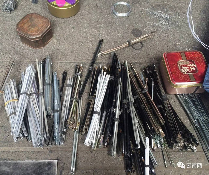 摊子虽小,零件齐全。李爷爷带来修伞的零件五花八门,有各种型号的伞骨,不同长度的伞把,还有大小不一的伞帽,以及雨伞开关。