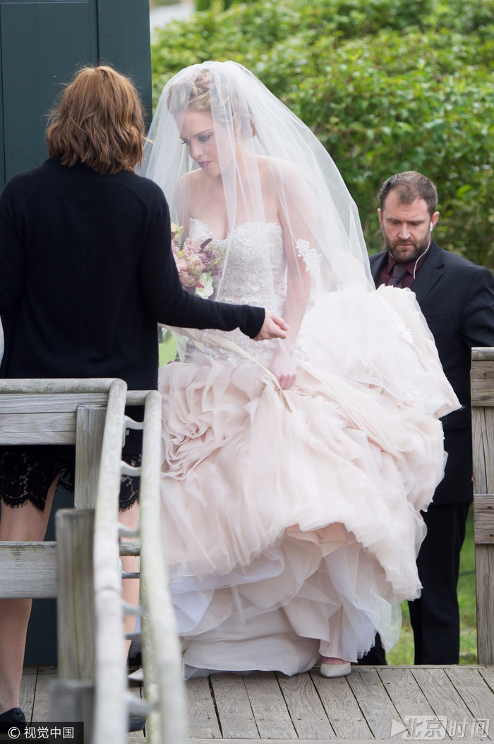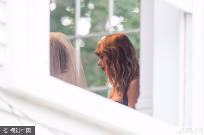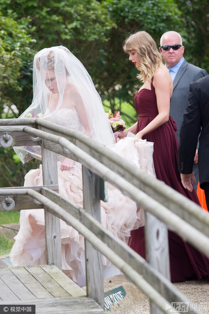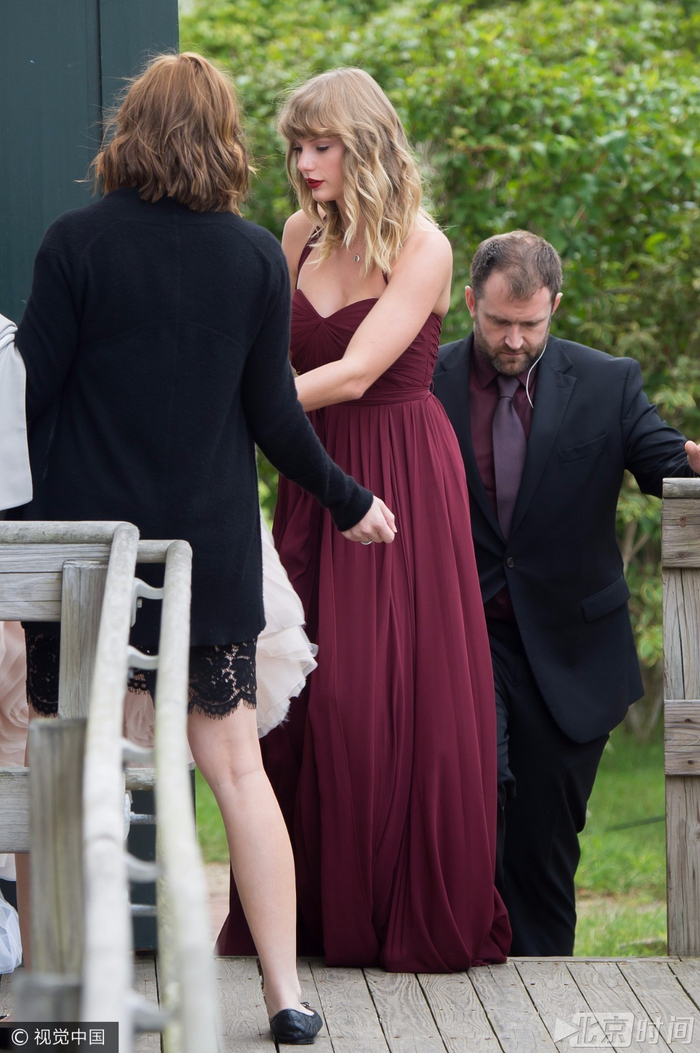当地时间2017年9月2日,美国马撒葡萄园岛,泰勒·斯威夫特(Taylor Swift)参加死党Abigail的婚礼,当伴娘为新娘提裙摆。