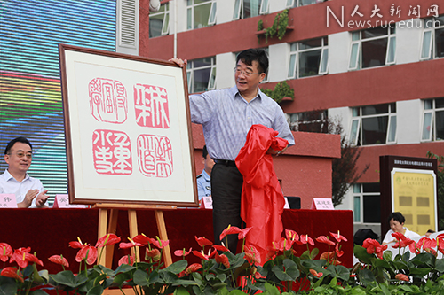 刘伟为人大附小新校训揭牌。新校训印章由人大附小书法教师崔旭升篆刻而成。