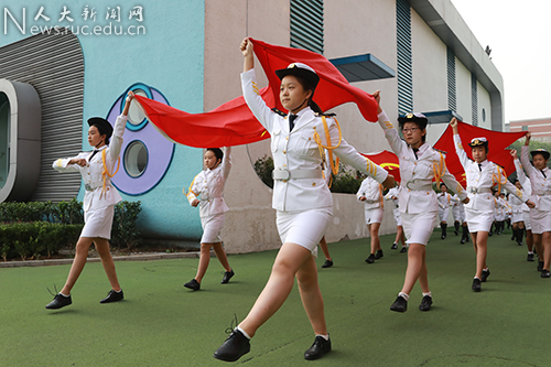 典礼在升旗仪式中开始。伴随着国歌声,五星红旗在与会领导、学生、教师和学生家长的瞩目中冉冉升起。随后,人大附小校旗和欢迎旗在人大附小校歌声中同时升起。