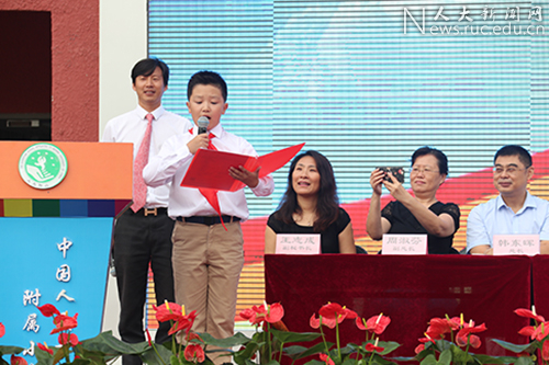三年级12班王大数、六年级3班邓郎青作为学生代表分享了自己对新校训的理解。王大数认为,“成仁才、至大道、得富学、重小事”的新校训体现了师长对大家的希望和要求,即要成为有仁德、有仁爱的才子,习得人生的大道理,收获知识和能力,并时刻注重从小事和细节做起。邓郎青朗诵了由人大附小2016年毕业生杨旭堃创作的小诗《新校训解读》,讲述了毕业生眼中的新校训。