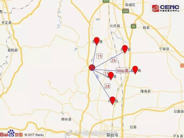 震中距临城县15公里、距赞皇县19公里、距高邑县26公里、距内丘县28公里、距柏乡县30公里,距邢台市50公里,距石家庄市61公里。