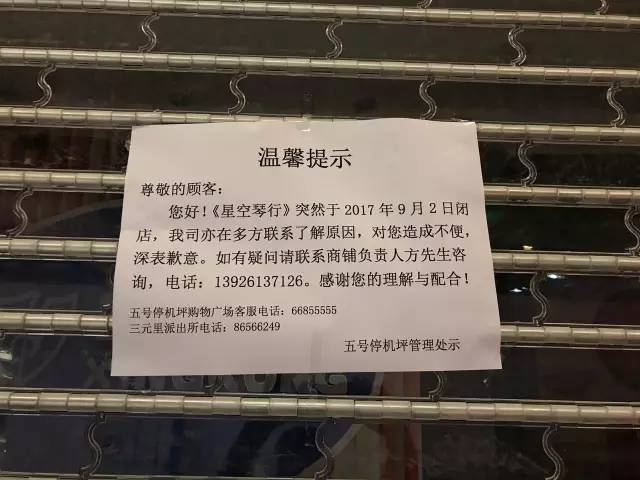唐小姐女儿学习钢琴的琴行是广州星空琴行五号停机坪店,记者2日下午14时许赶到时,店门口仍有多位家长在商讨维权事宜。门店大门紧闭,上面贴出了一张《温馨提示》。提示为五号停机坪管理处发出,文中称星空琴行突然于9月2日闭店,该管理处也在多方联系了解原因,如有疑问请联系商铺负责人方先生。文中还留下了方先生联系方式。