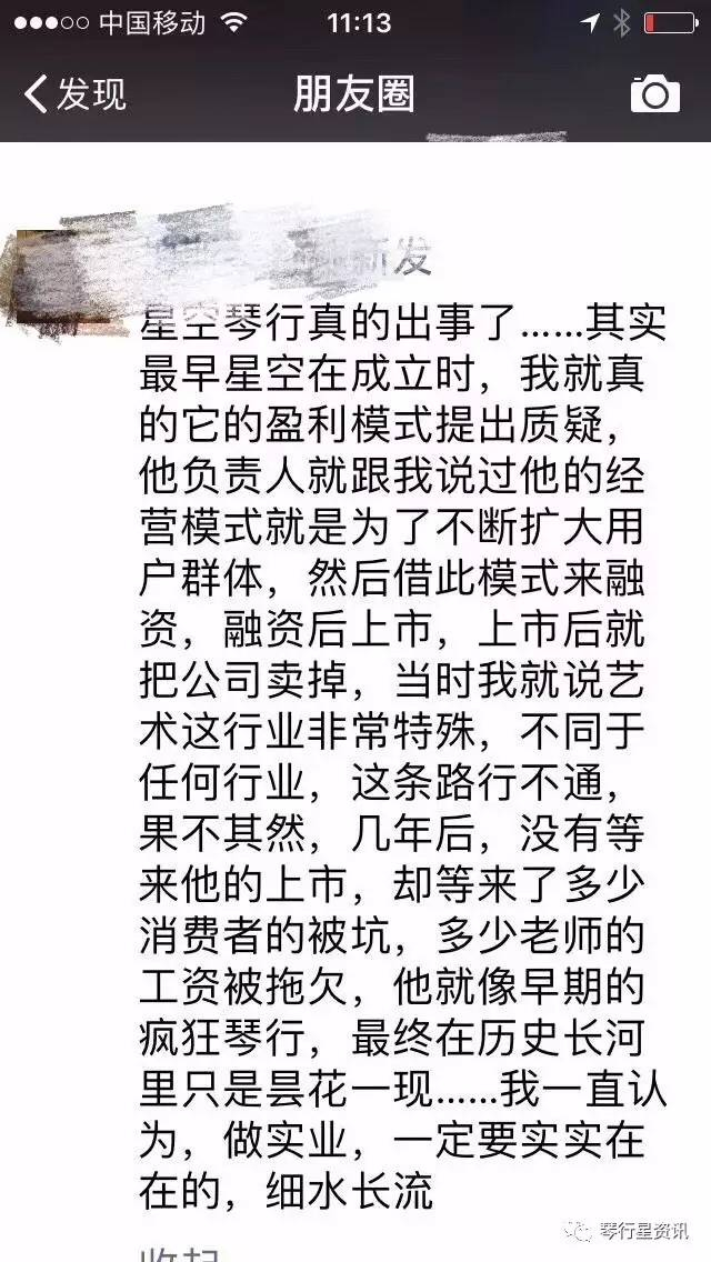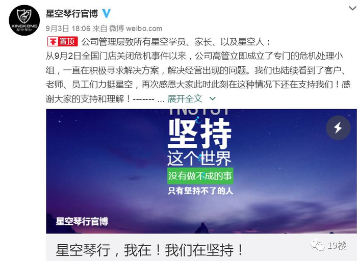 昨天傍晚(9月3日)6点左右,星空琴行在微信和微博上再次发布消息:“公司管理层致所有星空学员、家长、以及星空人:从9月2日全国门店关闭危机事件以来,公司高管立即成立了专门的危机处理小组,一直在积极寻求解决方案,解决经营出现的问题。我们也陆续看到了客户、老师、员工们力挺星空,再次感恩大家此时此刻在这种情况下还在支持我们!感谢大家的支持和理解!”
