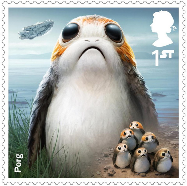 这套邮票包含8枚,由2015年那套邮票的画师Malcolm Tween绘制。票面上的8个人物分别是:《星战7》中首次出现的海盗玛兹·卡纳塔和第一秩序最高领袖斯诺克,星战系列经典角色楚巴卡,《星战8》中即将登场的鸟形萌系生物Porg,以及整个系列中出现的4个主要机器人角色——R2-D2、C-3PO、BB-8以及K-2SO。