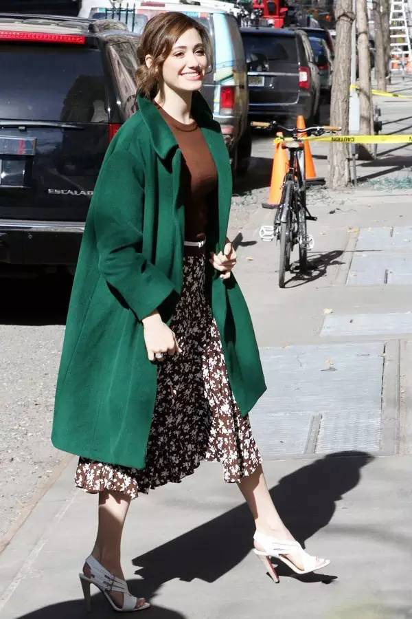 碎花裙配以绿色大衣,秋天依旧富有生命力的色彩。