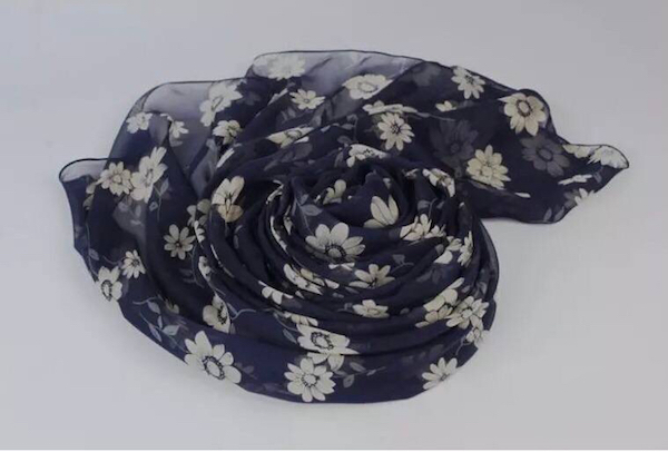 相对于缤纷的配色,藏青底色配白色雏菊花型的丝巾百搭甜美,更容易驾驭。