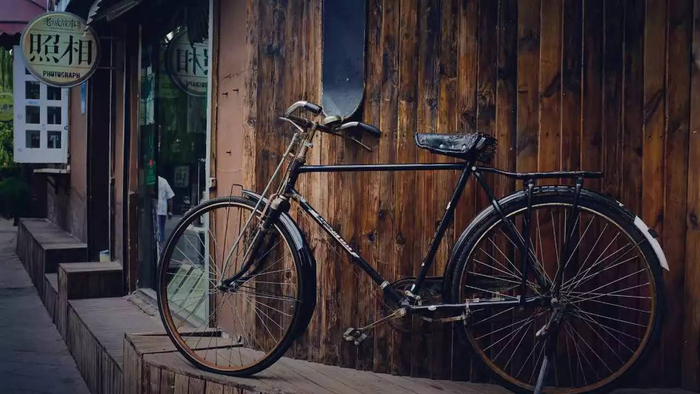 门口放着一辆破旧二八自行车,橱窗陈列着一组组黑白老照片,以及一些平时看不到的老物件。