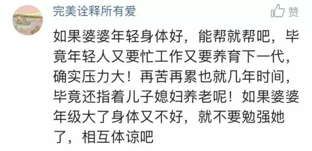 @喵一只大猫:帮不帮带孩子是父母的自由!说婆婆逼你生孩子,有本事你一辈子别生!我从来没想过想自己父母或者婆婆带孩子,自己带会更好,她们累了一辈子,也需要休息!父母帮你带孩子应该感激,那也不是她的义务!看到那么多评论,这三观。。。汗颜!